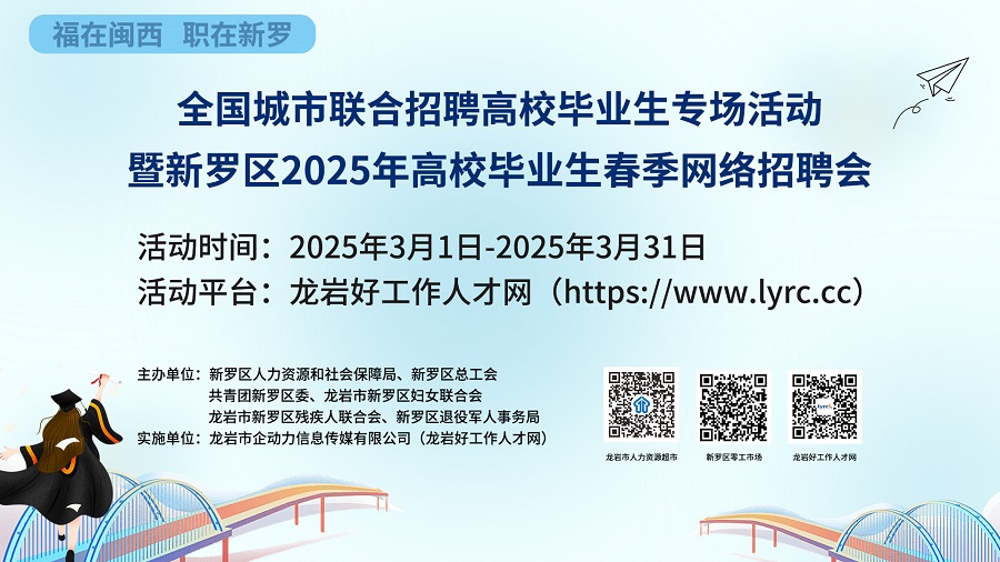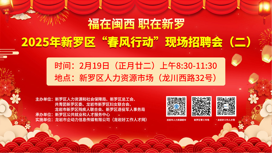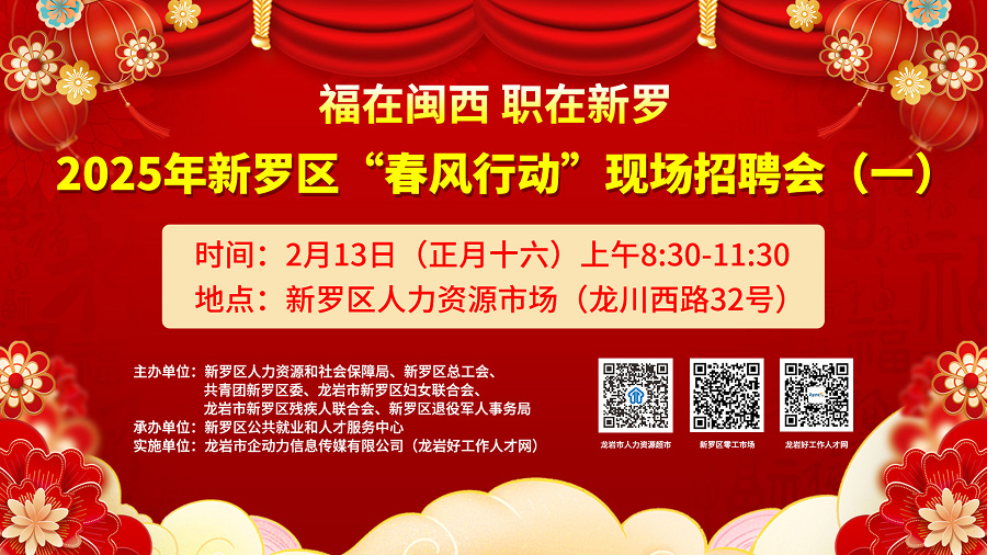 舉辦單位:新羅區(qū)人力資源和社會(huì)保障局 新羅區(qū)總工會(huì) 共青團(tuán)新羅區(qū)委 龍巖市新羅區(qū)婦女聯(lián)合會(huì) 龍巖市新羅區(qū)殘疾人聯(lián)合會(huì) 新羅區(qū)退役軍人事務(wù)局