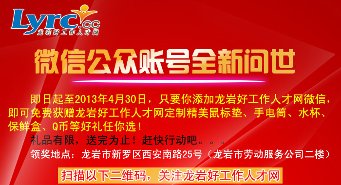 友情提示:龍巖好工作人才網(wǎng)敬請讀者選擇時(shí)注意自我保護(hù)并查驗(yàn)對方相關(guān)手續(xù)。勞動(dòng)法規(guī)定:招工禁收押金