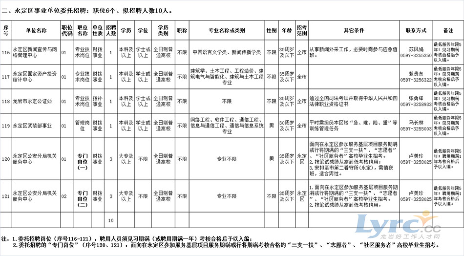 龍巖市永定區(qū)事業(yè)單位委托公開招聘職位中注明“專門崗位”的,專門面向在龍巖市永定區(qū)參加服務(wù)基層項目服務(wù)期滿或行將期滿考核合格的“三支一扶”、“志愿者”、“社區(qū)服務(wù)者”高校畢業(yè)生進(jìn)行招考。