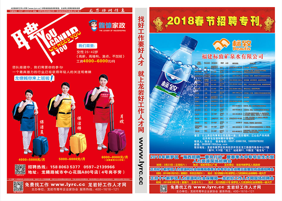 為進(jìn)一步做好龍巖市企業(yè)用工服務(wù)工作,促進(jìn)城鄉(xiāng)各類求職者充分就業(yè)為推薦企業(yè)、方便求職者,特推出實(shí)用的便捷式《2019年春節(jié)招聘專刊》,匯集當(dāng)前我市各企業(yè)招工信息,為求職者提供方便快速的參考指南。