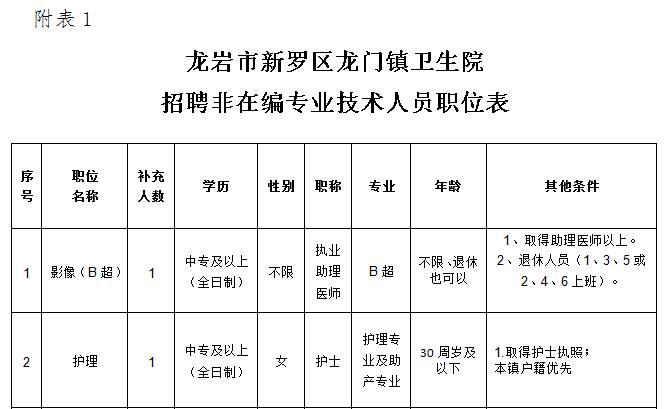 附表1:龍巖市新羅區(qū)龍門鎮(zhèn)衛(wèi)生院招聘非在編專業(yè)技術人員職位表(點擊下載)