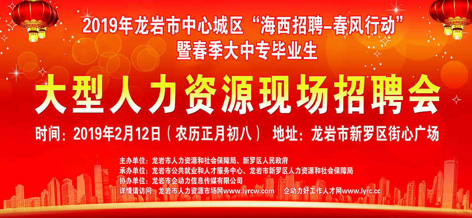 為全面貫徹落實黨的十九大精神,更好地服務(wù)發(fā)展、服務(wù)人才、服務(wù)民生,穩(wěn)定節(jié)后就業(yè)形勢,保障企業(yè)用工需求,促進大中專畢業(yè)生和城鄉(xiāng)各類求職者充分就業(yè),決定舉辦2019年龍巖市中心城區(qū)“海西招聘——春風(fēng)行動”暨春季大中專畢業(yè)生大型公益性人力資源現(xiàn)場招聘會,現(xiàn)將有關(guān)事項通知如下: