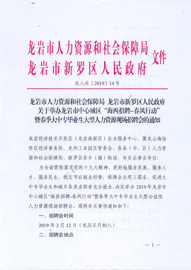 龍巖經(jīng)濟技術(shù)開發(fā)區(qū)(龍巖高新區(qū))企業(yè)服務(wù)中心、廈龍山海協(xié)作區(qū)經(jīng)濟事務(wù)局、龍州工業(yè)園區(qū)管委會、各縣(市、區(qū))人力資源和社會保障局、新羅區(qū)各鄉(xiāng)(鎮(zhèn))街道、有關(guān)企事業(yè)單位: