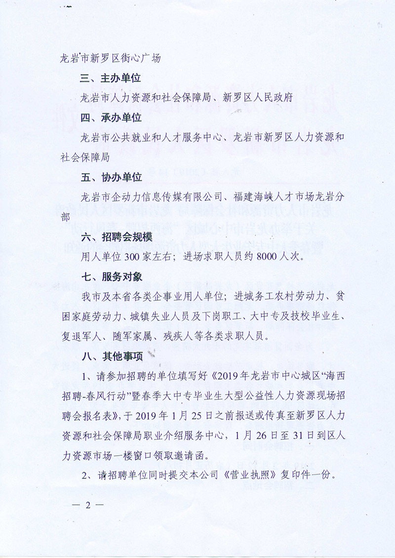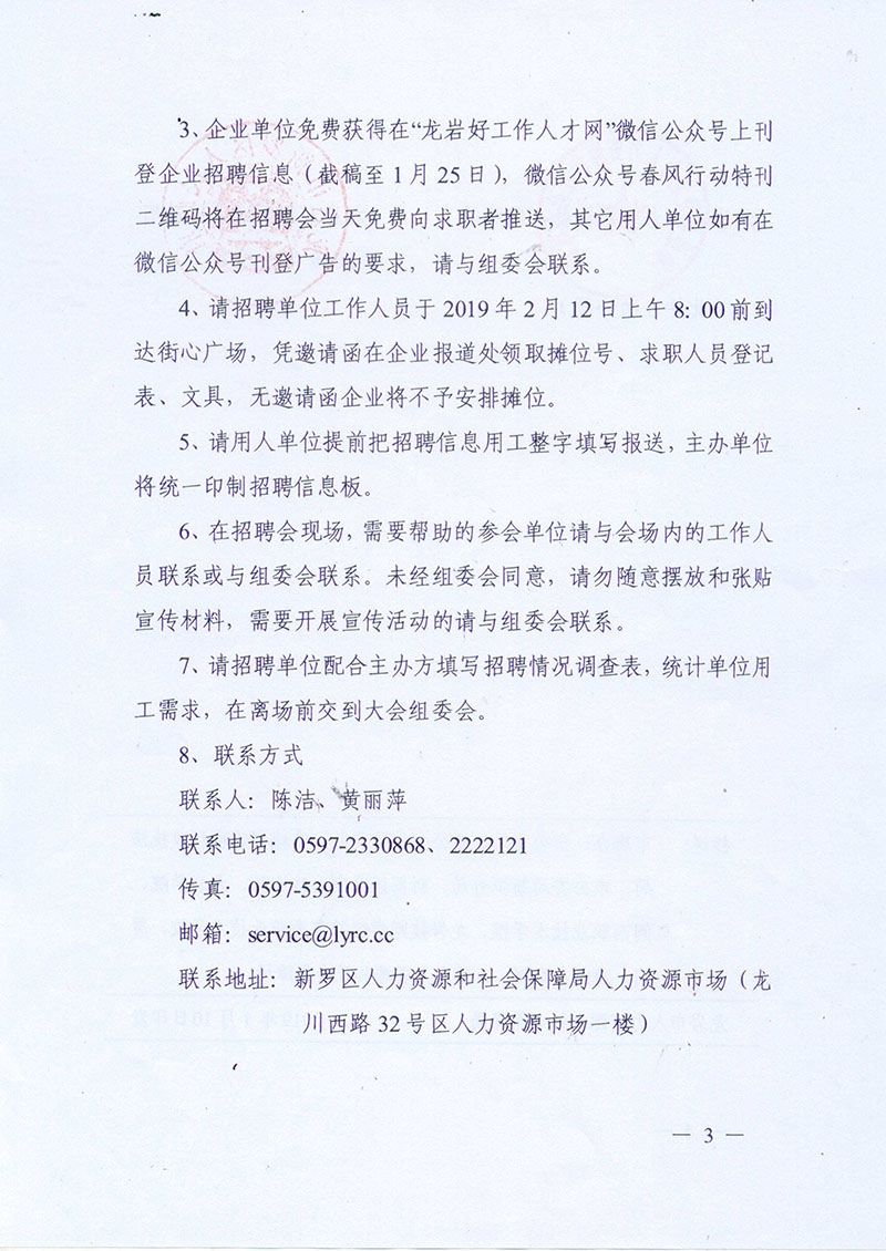 3、企業(yè)單位免費獲得在“龍巖好工作人才網(wǎng)”微信公眾號上刊登企業(yè)招聘信息(截稿至1月25日)、微信公眾號春風(fēng)行動特刊二維碼將在招聘會當(dāng)天免費向求職者推送,其它用人單位如有在微信公眾號刊登廣告的要求,請與組委會聯(lián)系。