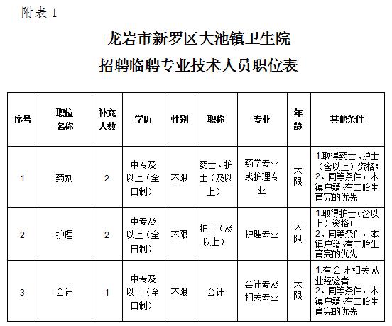 附表1:《龍巖市新羅區(qū)大池鎮(zhèn)衛(wèi)生院公開招聘臨聘工作人員職位表》(點擊下載)