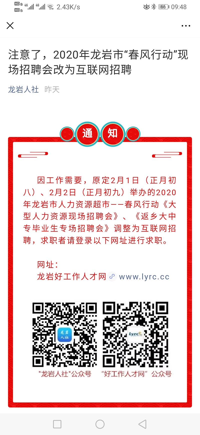 注意了,2020年龍巖市“春風(fēng)行動(dòng)”現(xiàn)場招聘會(huì)改為網(wǎng)絡(luò)招聘會(huì)