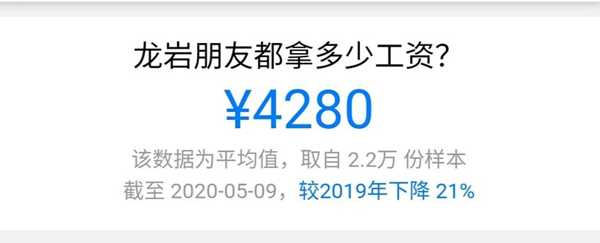 與此同時,受疫情影響,各地薪資水平均有不同的程度的下降。據(jù)某薪酬網(wǎng)站數(shù)據(jù)顯示,截至2020年5月9日,龍巖平均工資為4280元,比2019年下降21%(數(shù)據(jù)僅供參考)。