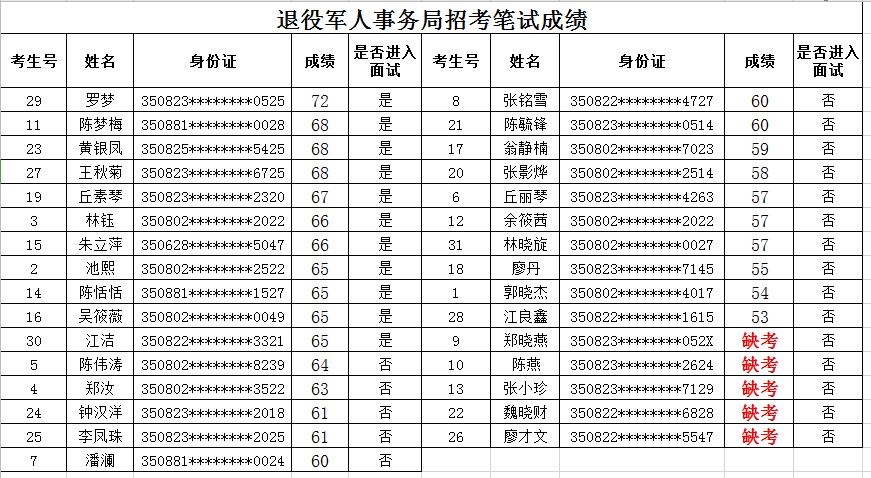 【成績公示】2020年新羅區(qū)退役軍人事務(wù)局招考成績公示