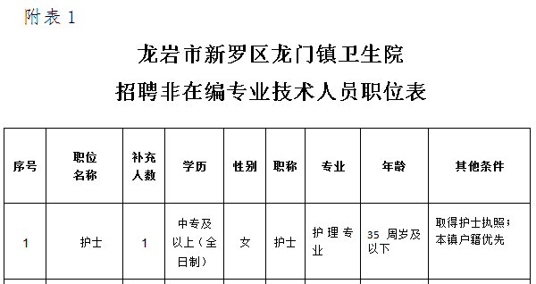 本次公開招聘非在編護(hù)士專業(yè)技術(shù)人員1名,具體的招聘職位、招聘人數(shù)及職位資格條件等,詳見《龍巖市新羅區(qū)龍門鎮(zhèn)衛(wèi)生院公開招聘非在編專業(yè)技術(shù)人員職位表》(見附件1)。