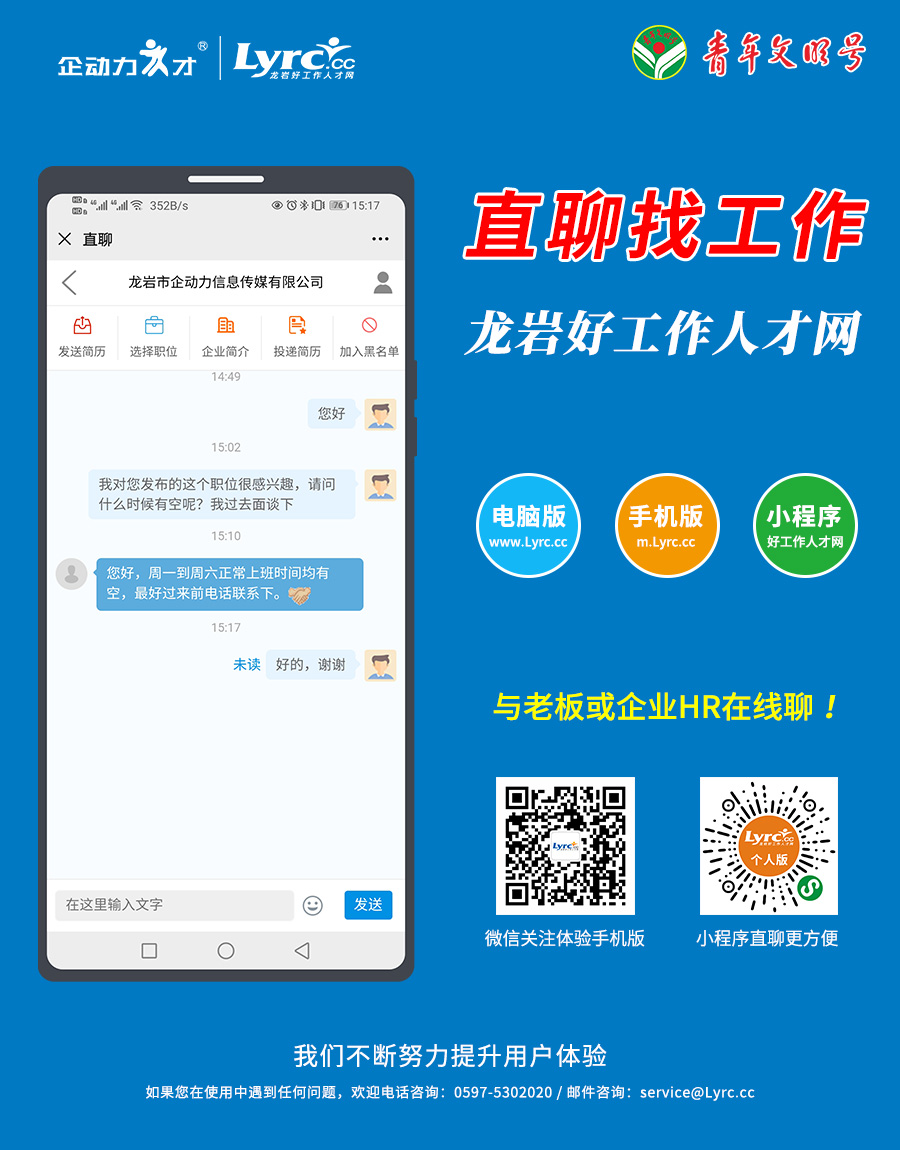 本網(wǎng)站經(jīng)福建省龍巖市人社局批準(zhǔn),為正規(guī)合法人才網(wǎng)站,人力資源服務(wù)許可證:(閩)人服證字〔2019〕第0801000113號
