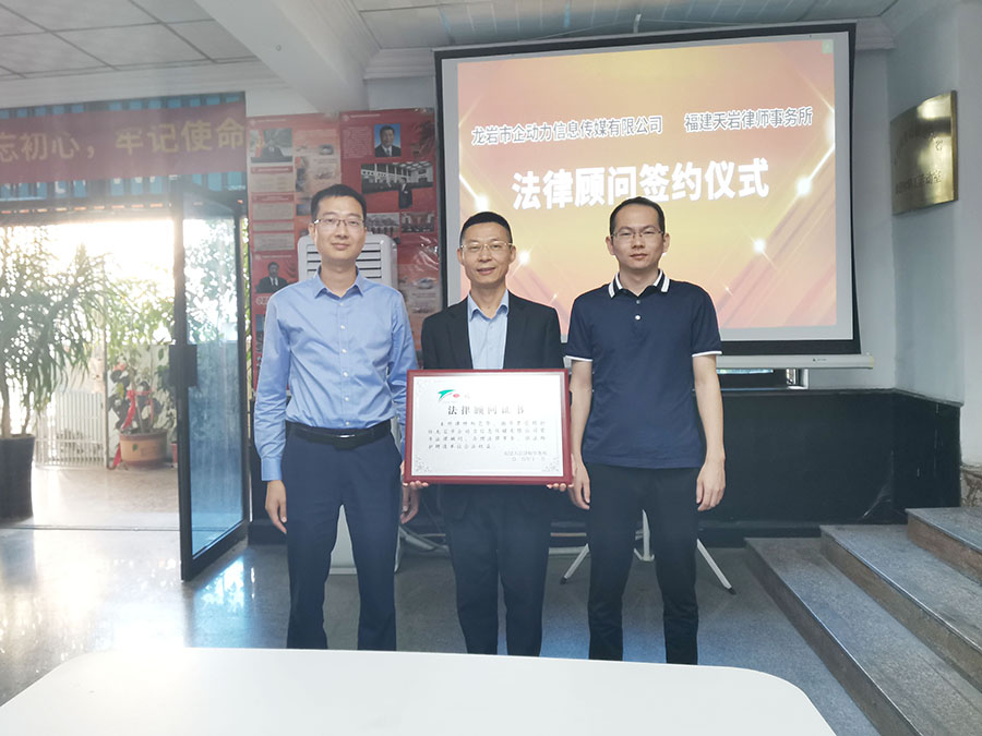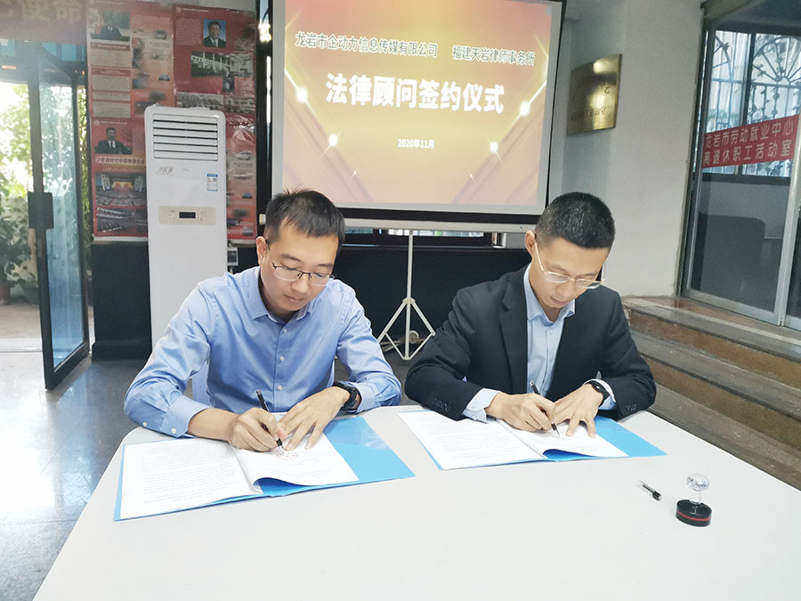 2020年11月4日,龍巖市企動力信息傳媒有限公司聘請福建天巖律師事務(wù)所擔任常年法律顧問的簽約儀式,在企動力公司二樓大廳舉行。龍巖市企動力信息傳媒有限公司總經(jīng)理張勁華、福建天巖律師事務(wù)所副主任鄭藝華律師出席儀式并簽署常年法律顧問服務(wù)合同。