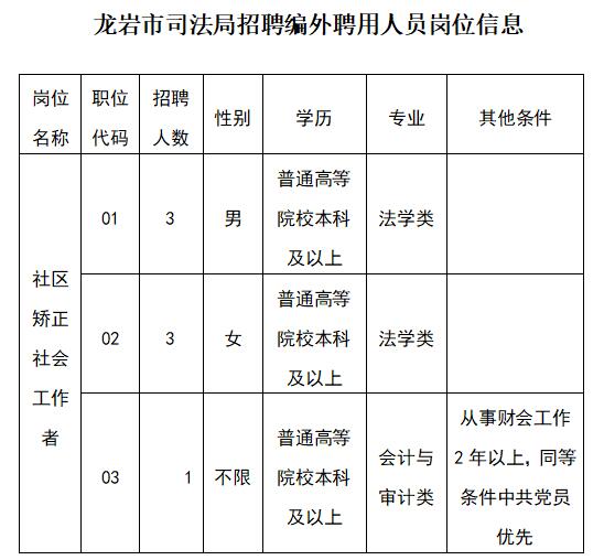 一、招聘崗位名額:龍巖市司法局社區(qū)矯正社會(huì)工作者崗位編外聘用人員7名,詳細(xì)崗位信息見附件1。