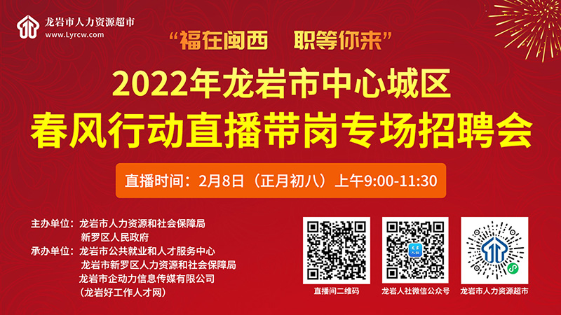 【正月初八直播】“福在閩西 職等你來(lái)”2022年龍巖市中心城區(qū)春風(fēng)行動(dòng)直播帶崗專場(chǎng)招聘會(huì)