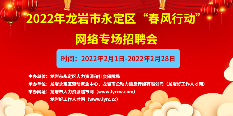 為做好春節(jié)期間永定區(qū)就業(yè)創(chuàng)業(yè)工作,為企業(yè)與求職者提供線上交流平臺,永定區(qū)人力資源和社會保障局?jǐn)M舉辦“2022年永定區(qū)春風(fēng)行動網(wǎng)絡(luò)專場招聘會”