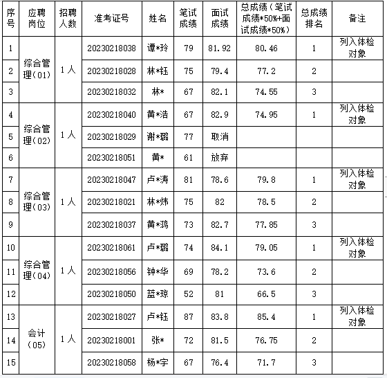 根據(jù)2023年1月1日發(fā)布的《新羅區(qū)供銷合作社聯(lián)合社關(guān)于公開招聘基層供銷社(集體所有制企業(yè))工作人員的公告》、2023年1月11日發(fā)布的《新羅區(qū)供銷合作社聯(lián)合社關(guān)于公開招聘基層供銷社(集體所有制企業(yè))工作人員的補(bǔ)充公告》有關(guān)要求,新羅區(qū)供銷合作社聯(lián)合社基層供銷社(集體所有制企業(yè))綜合管理(崗位代碼01)等5個(gè)崗位考試(筆試+面試)環(huán)節(jié)已經(jīng)組織完成,現(xiàn)將總成績給予公示: