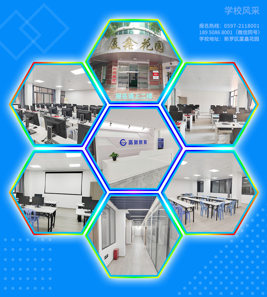 • 環(huán)境優(yōu)美:學校位于龍巖市新羅區(qū)西安南路341號(廈鑫花園副樓2層),擁有618平米教學場地,符合消防要求,教學軟件硬件設施設備齊全。