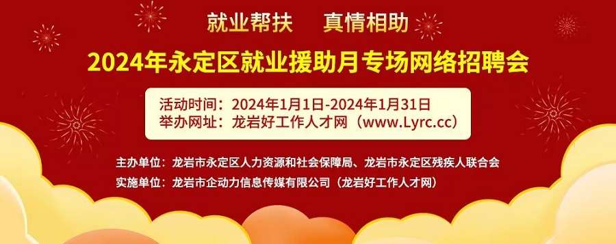 為全面貫徹黨的二十大和二十屆二中全會精神,加強困難群體就業(yè)兜底幫扶,龍巖市永定區(qū)人力資源和社會保障局、龍巖市永定區(qū)殘疾人聯(lián)合會定于2024年元旦、春節(jié)期間在全區(qū)組織開展就業(yè)援助月專項活動,集中幫扶就業(yè)困難人員就業(yè)創(chuàng)業(yè),擬舉辦2024年永定區(qū)就業(yè)援助月專場網(wǎng)絡(luò)招聘會,具體方案如下: