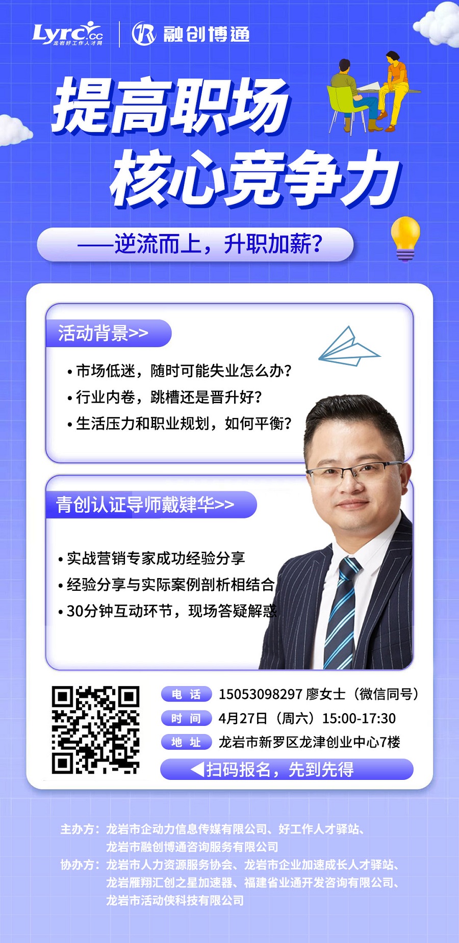 好工作人才網(wǎng)和融創(chuàng)博通咨詢服務(wù)公司共同主辦,特邀福建省創(chuàng)業(yè)導(dǎo)師、福建青創(chuàng)認(rèn)證導(dǎo)師、20年實(shí)戰(zhàn)營銷專家戴肄華,成功經(jīng)驗(yàn)分享,結(jié)合實(shí)際案例剖析,我們一起逆流而上,向升職加薪出發(fā)!同時(shí)還將預(yù)留30分鐘進(jìn)行互動(dòng),授課老師接受大家提出的各種疑問,提問名額有限,請大家提前準(zhǔn)備好與主題相關(guān)的問題,做好搶麥的準(zhǔn)備。